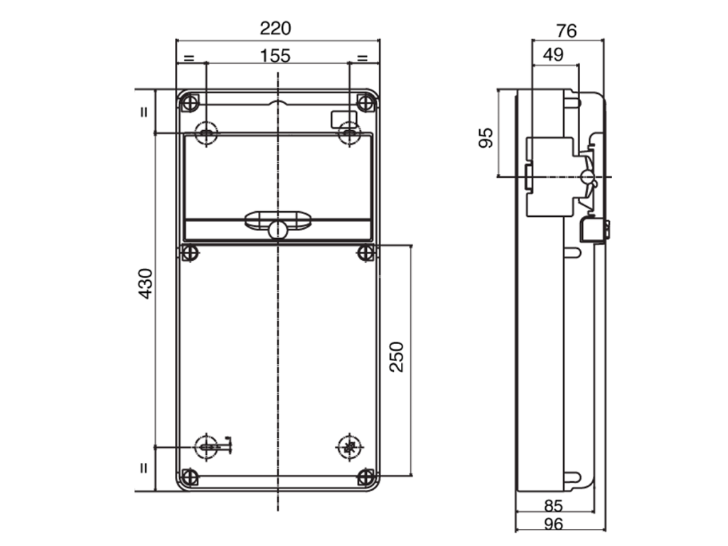 Celkové vonkajšie rozmery rozvádzača sú 220 × 435 × 76 mm (šírka × výška × hĺbka).