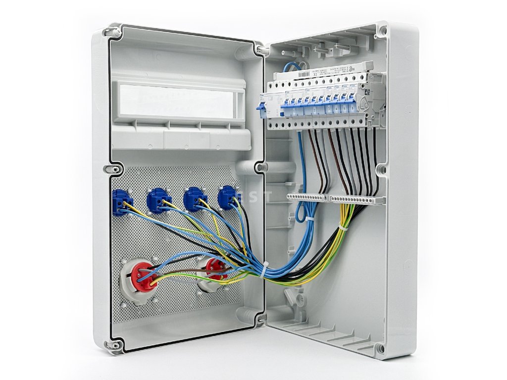 Nástenná zásuvková skrinka je vybavená týmito komponentmi: