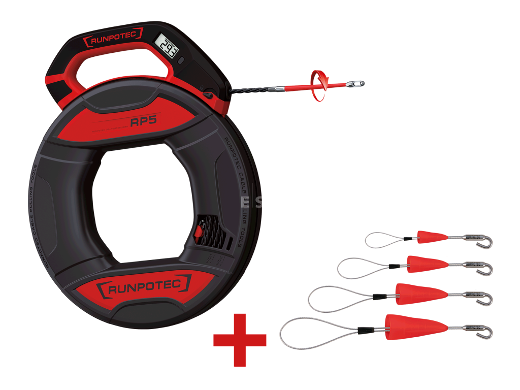 Preťahovacie pero RP5 od firmy RUNPOTEC (Ø 5,5 mm) je preťahovací nástroj s digitálnym počítadlom metrov. Trojmo zakrútená špeciálna plastová páska s priemerom 5,5 mm má lepší strihový efekt než pero zo skleného vlákna Ø 3 mm; frikčný odpor je vďaka bodovému kontaktu len polovičný oproti štandardnej hodnote. Patentovaný vodiaci hrot RG7 s otočným kĺbom (Ø 5,5 mm, lisovaný na začiatok aj koniec pásky) umožňuje prekonanie tesných polomerov ohybu (polomer ohybu 15 mm). RP5 je uložené v robustnom úložnom boxe s ergonomickým držadlom a ochranou proti spätnému sklzu. Celková pevnosť v ťahu 270 kg sa vzťahuje na celý preťahovací systém. Systém je prakticky nerozbitný.