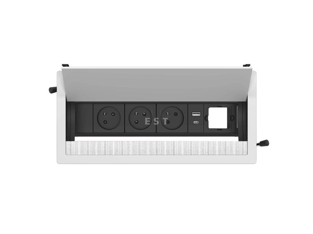 Jednotka je plne modulárna a umožňuje kombinovať štandardné napájacie zásuvky s výkonnými nabíjacími USB portami a voľnými pozíciami pre moduly Keystone. Do týchto pozícií možno ľahko integrovať konektory pre prenos dát a multimédií (napr. RJ45, HDMI alebo USB dáta) presne podľa špecifických potrieb vášho projektu. Prívod energie je riešený prostredníctvom profesionálneho systému konektorov GST, ktorý umožňuje bezpečné a rýchle zapojenie aj sériové prepojovanie viacerých jednotiek pod doskou stola.