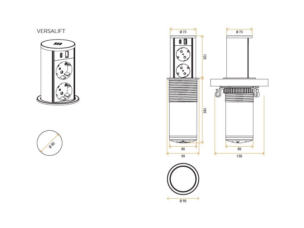 VersaLift od ASA Plastici je prémiová, výsuvná zásuvková jednotka talianskeho dizajnu, ktorá kombinuje eleganciu s vysokou funkcionalitou. Vďaka kompaktnému inštalačnému priemeru iba 80 mm sa VersaLift ľahko inštaluje takmer do každej pracovnej dosky a zmestí sa aj do stolových nôh s priemerom 100 mm. Malý otvor zaisťuje viac priestoru na pracovnej ploche a umožňuje čisté, usporiadané a funkčné riešenie. Elegantný a moderný vzhľad v prevedení čierny metakrylát sa prirodzene začleňuje do každého interiéru, vhodný do kuchýň, kancelárií aj hotelových lobby.