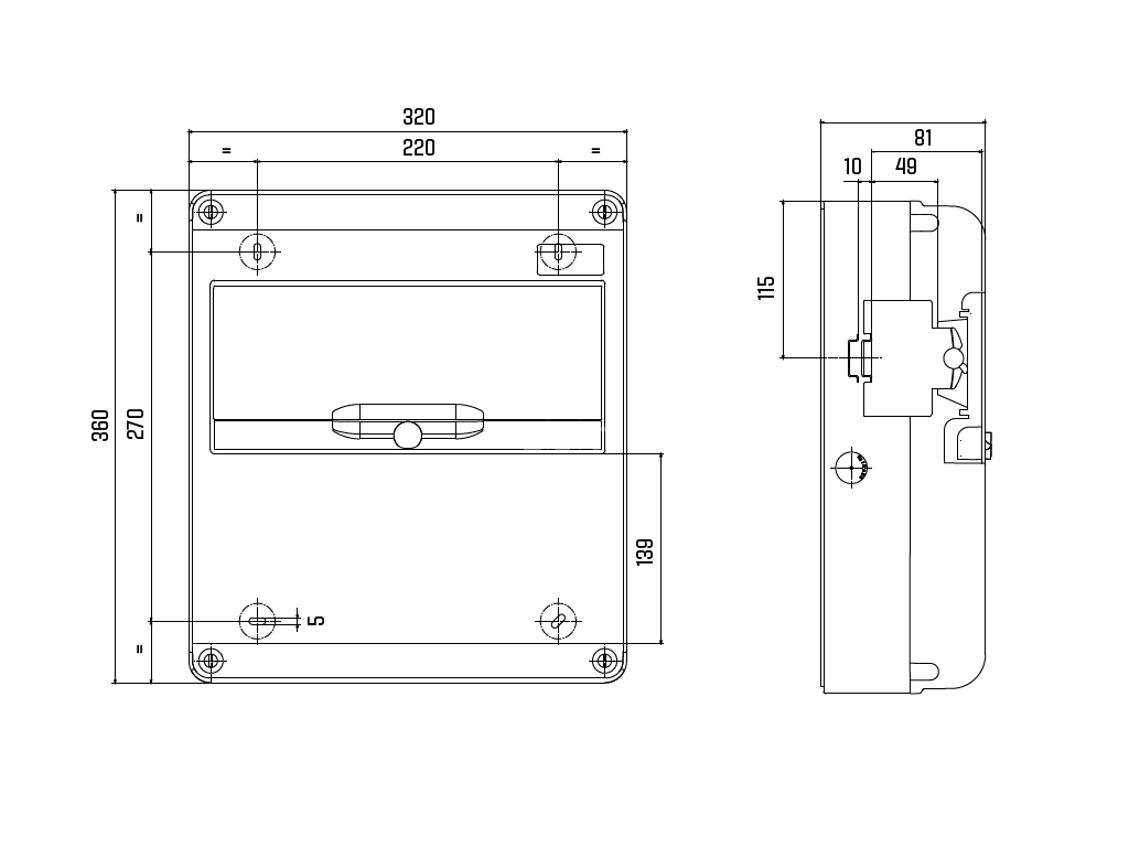 Celkové vonkajšie rozmery rozvádzača sú 320 × 360 × 81 mm (šírka × výška × hĺbka).